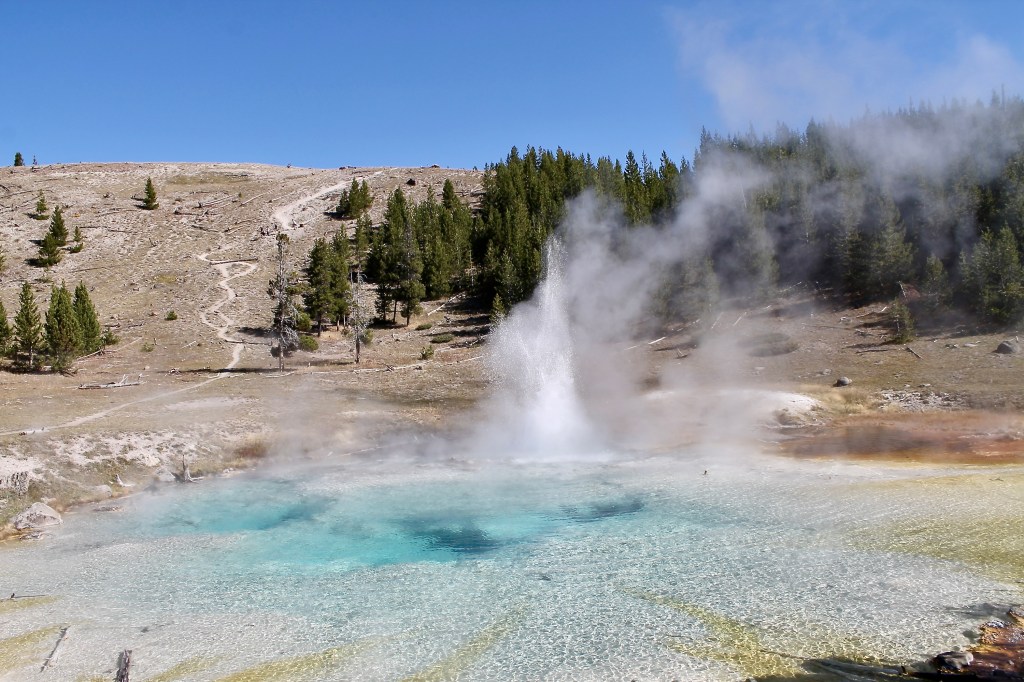If you continue on the trail past Fairy Falls for another 1/2 mile there are two geysers. The last time we walked here this geyser was just a pretty pool. Now it was almost continuously shooting water! Well worth the additional footsteps! We did not walk up to the overlook that you can see in the background so I can’t tell you if it was worth the hike, lol.