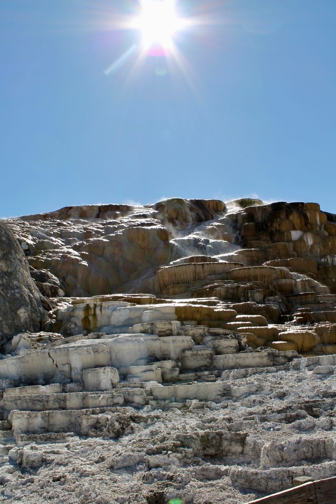 The terraces at Mammoth are one of the features that seem to change every time we visit. The water flows in new directions and the old areas become dry and new areas begin to shine.
