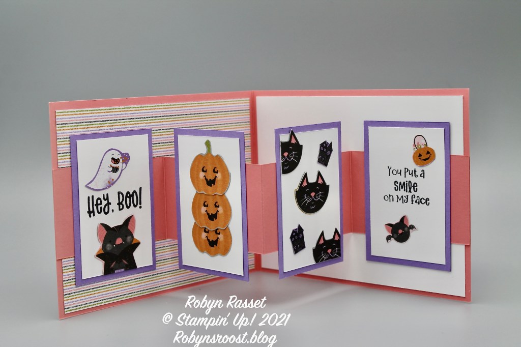 All of these little critters and pumpkins are hand cut from the Cute Halloween Designer Series Paper. Aren’t they AWESOME! I even used a half pumpkin from the edge for the pumpkin stack, actually that’s what gave me the idea to stack the pumpkins. Can’t waste these cute guys! The greetings are from the Cutest Halloween stamp set and aren’t they even more fun when they pop out on the W Fold strip?