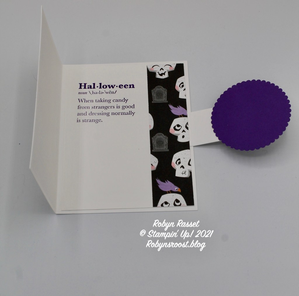 For the inside greeting, I used the Halloween definition from the Well Defined stamp set. This view also shows how the scalloped circle is adhered to the back of the flap.