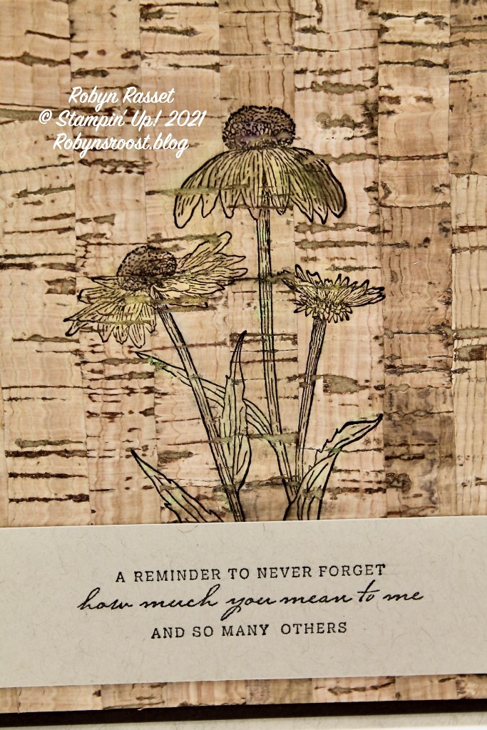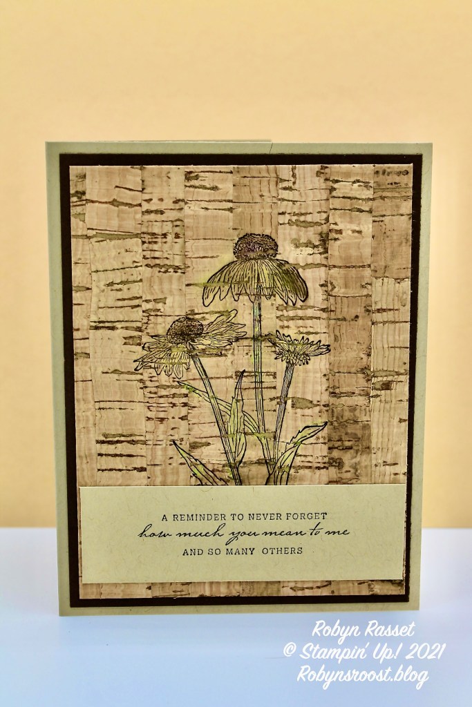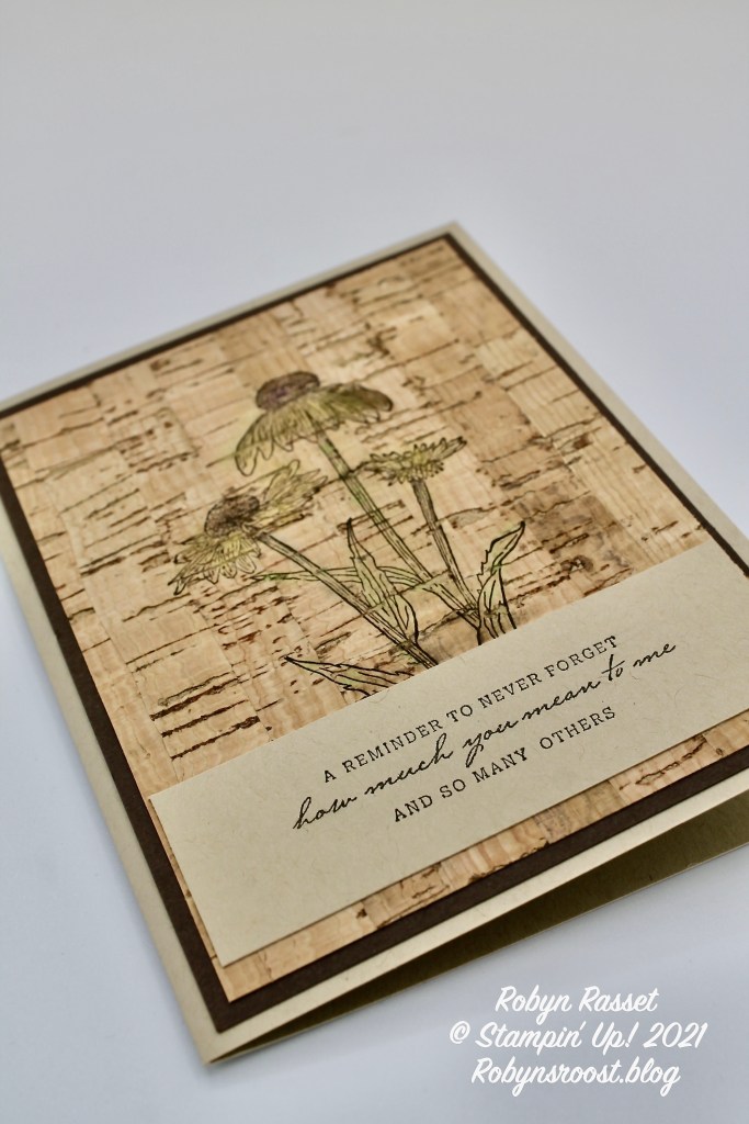 Did you notice the Cork Paper on page 55 of the Stampin’ Up! July to December Mini Catalog? It’s really easy to work with. It can be punched, die cut or stamped on. It’s light weight and works great for accents.