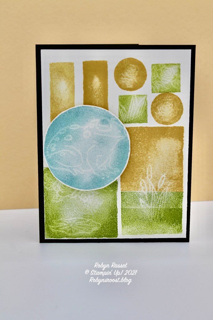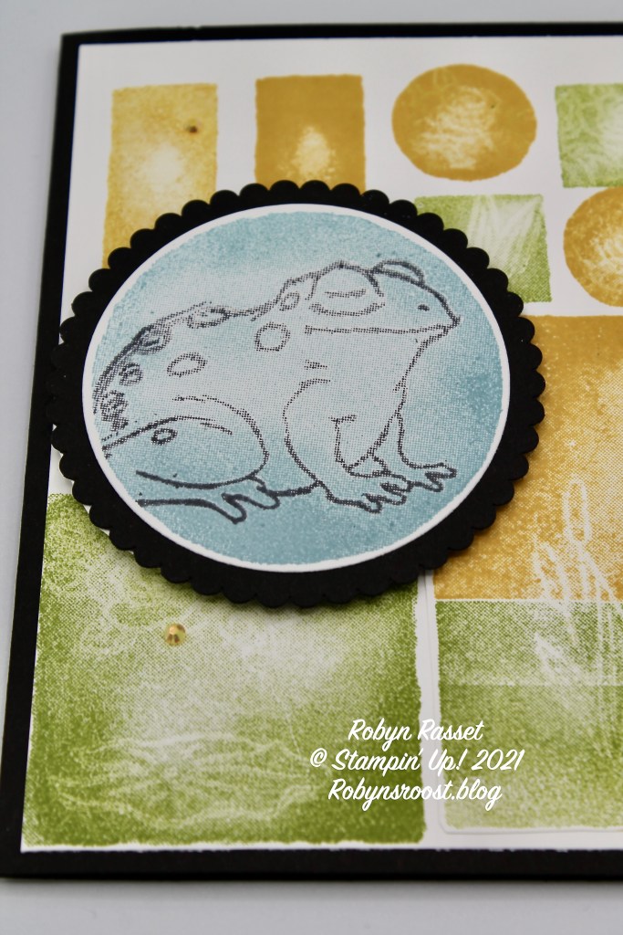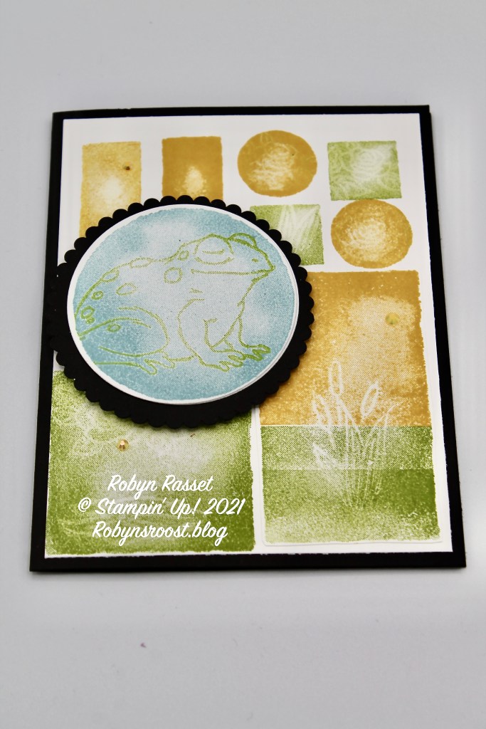 The card above shows how the frog looked when an uninked frog stamp was used on the inked background stamp. It just didn’t show up well enough to be the focal image. I also added the scalloped black circle to make it stand out more.