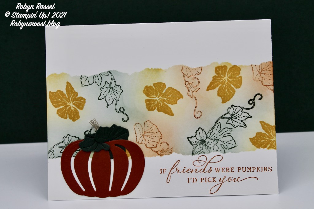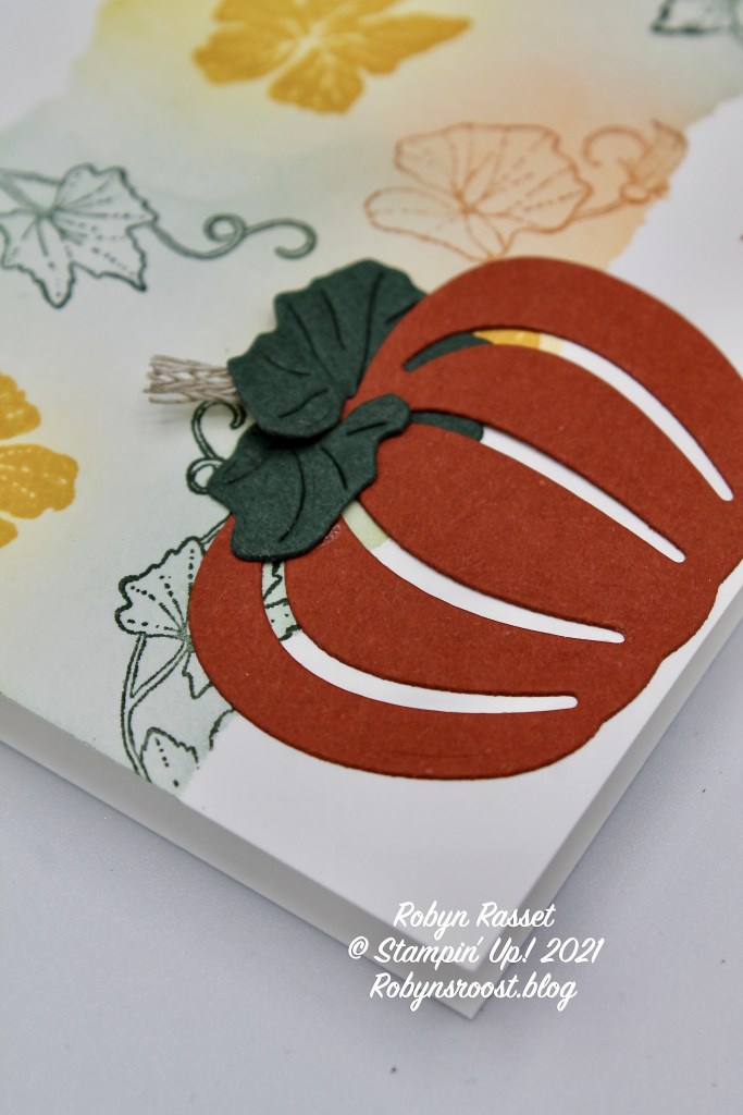 I like to keep a handful of blending brushes around, one for each basic color. I don’t wash them between uses. I love this pumpkin die with the open slots. The leaves have slots in them to they can be snuggled around the pumpkin stem. The greeting is stamped using the Cajun Craze ink.
