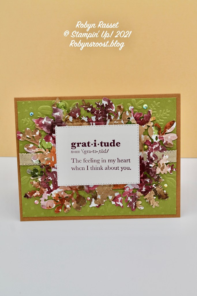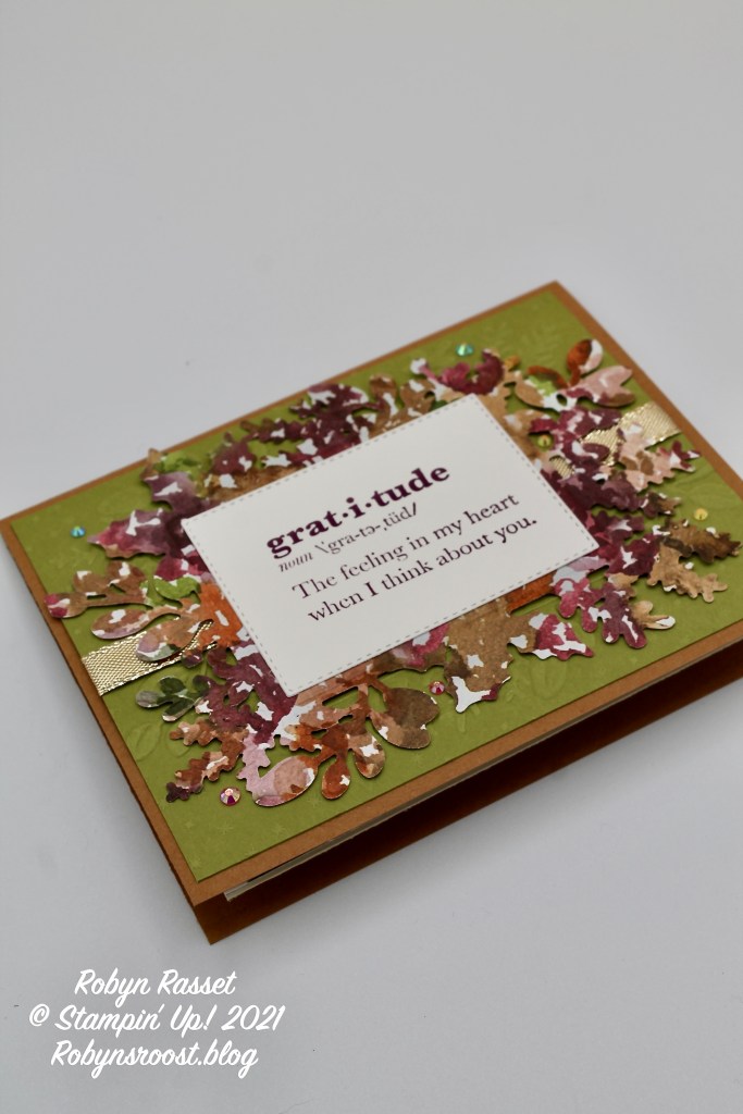 The 4″ x 5 1/4″ piece of Old Olive paper is also embossed using the Merriest Frames Embossing Folder. You can see how pretty this embossing folder is without any die cuts! With the die cut layer ‘flipped’ to the back side, the two images don’t line up and more of the embossed leaves are visible on the Old Olive layer. For a bit of shimmer, the 3/8″ Shimmer Ribbon is added between the old olive and Beauty of the Earth layers. I’ve also added 6 of the 2021-2023 In Color Jewels in multiple colors.