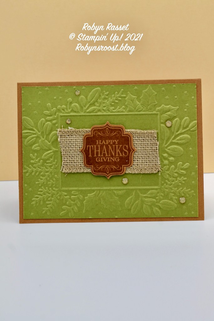 This card was one that I thought of while I was creating the first one. I loved the Old Olive embossed layer on top of the Cinnamon Cider card base and wanted to try a card where the embossed layer really showed. The Thanksgiving greeting is from the Tags 4 You stamp set from the 2013 Holiday Catalog. It had a matching punch to make quick work shaping the label. It is stamped on Cinnamon Cider paper using Cinnamon Cider ink, and is layered onto a small piece of 1 1/4″ burlap ribbon. Genial Gems are scattered across the front to give a bit of sparkle to an otherwise earthy card.