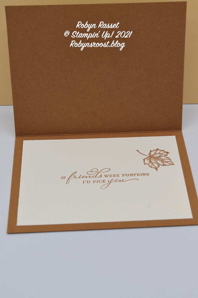 The inside is also stamped with Cinnamon Cider ink and the greeting is from the Pretty Pumpkins stamp set. The leaf is from the Time of Giving stamp set. The leaf stamp has 3 leaves on it and I carefully inked just the one leaf. If you want to do it in a more sure way(Like, take your time and do it right, hahaha), use a piece of scotch tape and cover the leaves that you don’t want to use, ink the stamp, then remove the tape before stamping.
