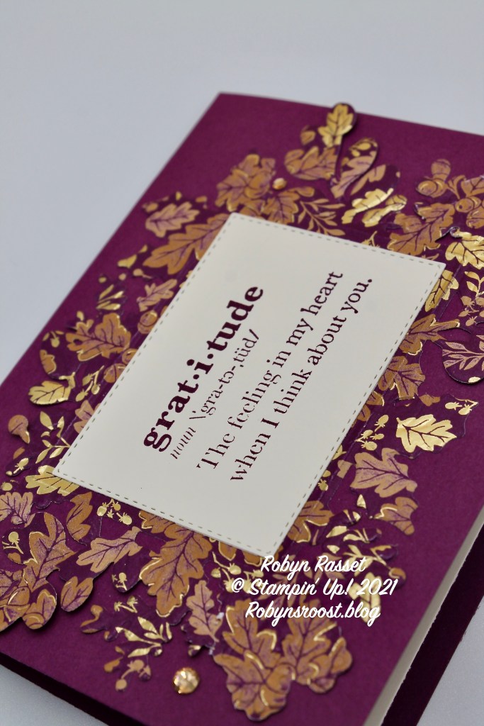 Hello, today’s card focuses on gratitude, but first I want to share with you some of the gratitude that I feel for having been able to attend a Scrapbooking Event yesterday. It was put on by the ladies at Faith Lutheran Church in Waconia, Minnesota. The event ran from 9 am to 9 pm and my goal was to get 9 scrapbook pages done. I came so close! All I have to do is glue down the pieces on the last page. I had so much fun talking with two of my best friends, Sandy and Paula, and meeting some other very creative women. The food was AWESOME! If I ran low on inspiration all I had to do was head to the food bar and my inspiration was restored. I’ll be sharing my pages later today on a Facebook Live as well as some cool Sampler Squares that I received in a swap. So on to the main story…