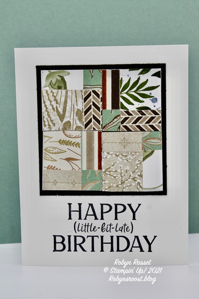 To finish off the card. Adhere the square to a Basic White card base and stamp a greeting beneath the square. This tongue in cheek greeting is from the Happiest of Birthday’s stamp set and is one that I need often.