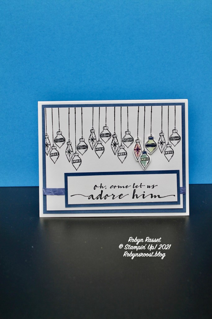 This pretty Christmas card combines the fun ornament images from the Stars are Shinning stamp set and the greeting from the For Unto Us stamp set. Both sets are wonderful additions to your stamp collection. One of the talented STARS demonstrators made this card but I don’t remember which one. So if any of the STARS are reading this give a shout out and I will update this post with the name of the artist. I love the way that she spotlighted the two ornaments by coloring them and fussy cutting, then popping them up with dimensionals.