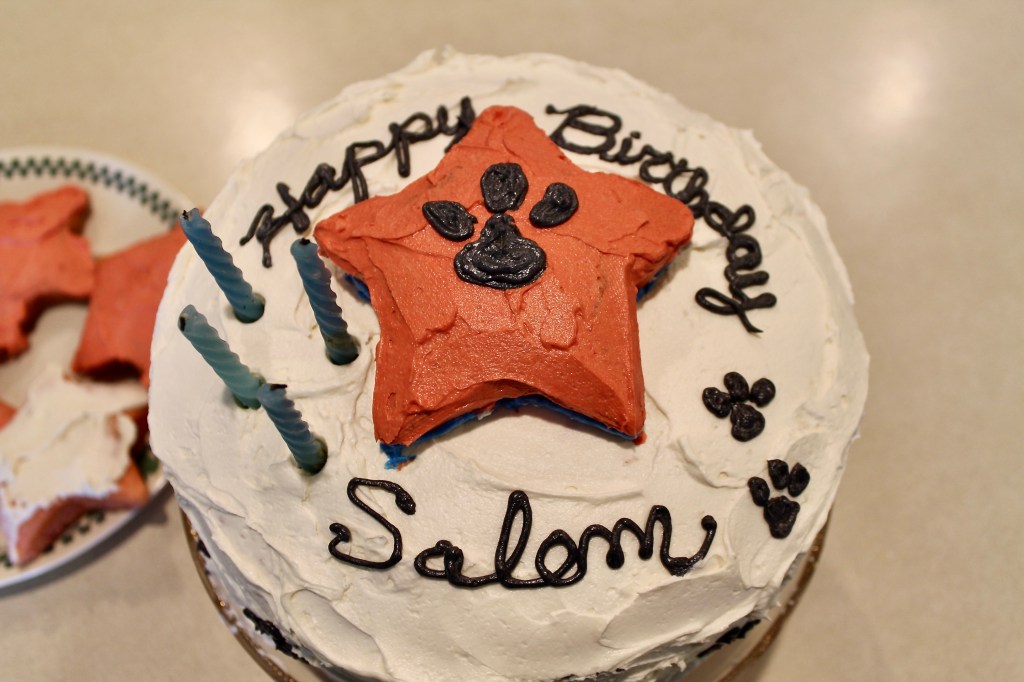 So this is my Strawberry Paw Patrol Cooking Theme Birthday Cake! For the cooking theme, I placed it on my grandmother’s fancy glass cake stand and left the frosting fluffy rather than smooth. Of course, the pups were leaving prints all over the cake, Salem said that those were the bad pups, lol. The first thing he did when he saw it was give a LOUD squeal of delight, so it was a hit. He loved that his name was on it too. It was three layers of cake so it looked pretty ‘grand’ on the footed cake stand. He’ll get to enjoy it for a few more days, because after the pile of pizzas we ate, the gang only ate half the cake.
