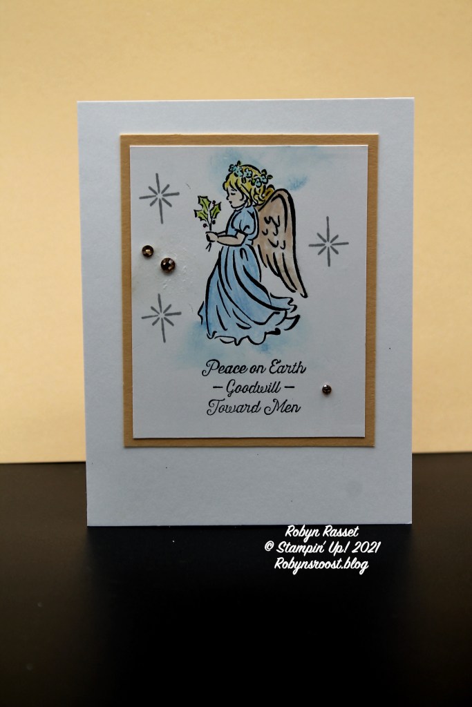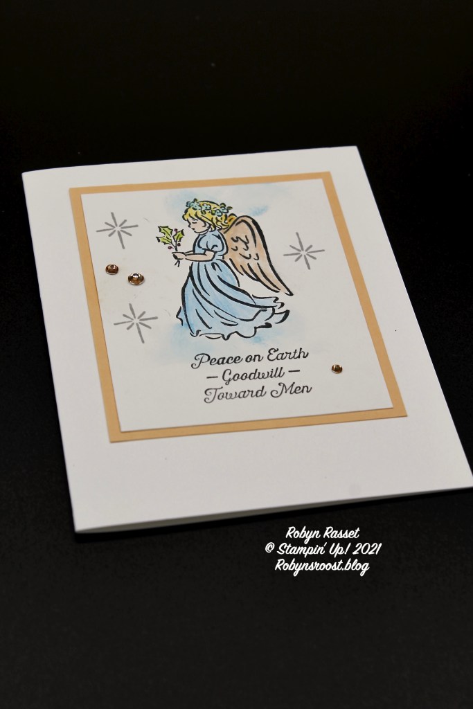 This stamp set made me think of my mother-in-law. She had angels everywhere in her house. Now that I’ve gotten older, I realize that may not mean that she really LOVED having angels all over her house, but that everyone thought she needed angels all over her house because she liked them. Christmas is a joyful time, but it’s also a time when I think about the people that I love that are no longer here. When I get sad about them being gone, I try to pull out some of the wonderful memories that I have of them. See why it takes me so long to decorate!