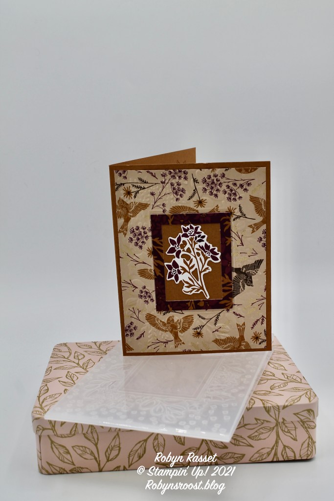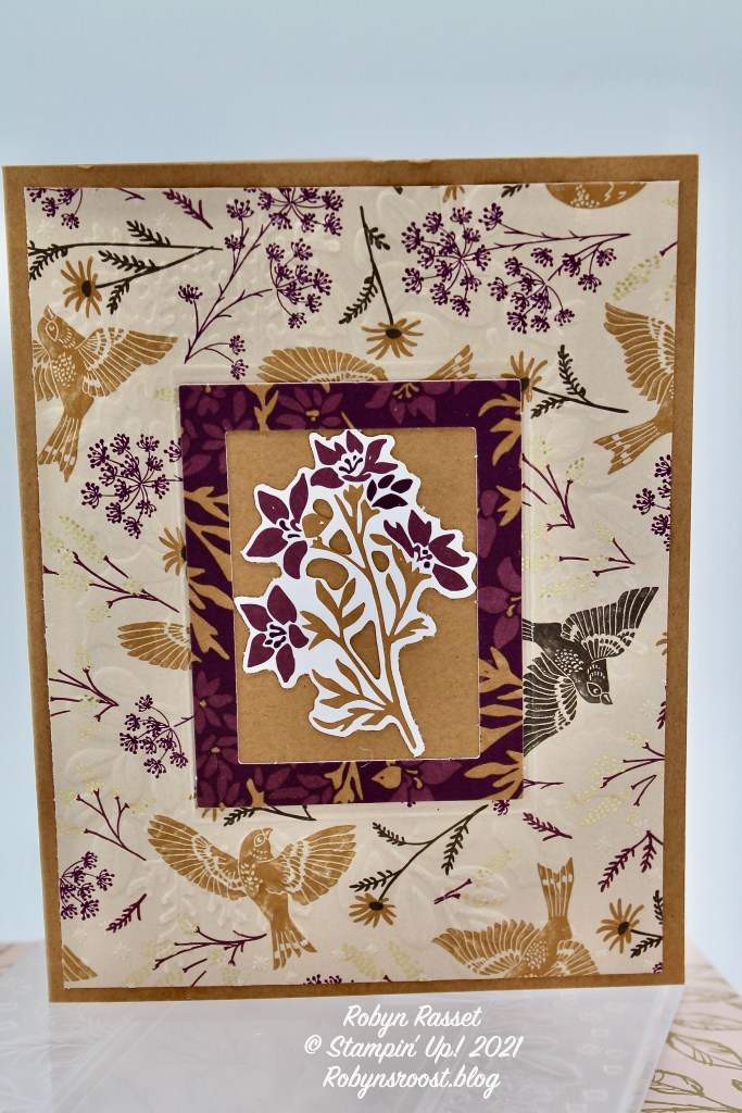 Sometimes it’s nice to have a card on hand without any greeting or specific theme. This card doesn’t have any stamping but relies on the pretty Blackberry Beauty Ephemera Pack and Blackberry Beauty Designer Paper.
