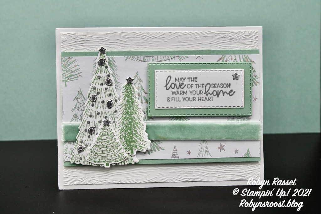 Susan’s crd uses the soft green and silver colors from the Whimsy & Wonder designer paper (sadly it was so popular that it is sold out!). A similar effect could be achieved by stamping the trees on the background and even embossing some with silver embossing powder. The greeting is also from the Whimsical Trees stamp set. I love how the die has multiples of the tiny ornaments on on die so that you can cut out a whole bunch in one pass. The greeting layers are cut using the Stitched Rectangle Dies. The Mint Macaron Velvet Ribbon adds some fun texture along with the white background which is embossed with the Timber Embossing Folder.