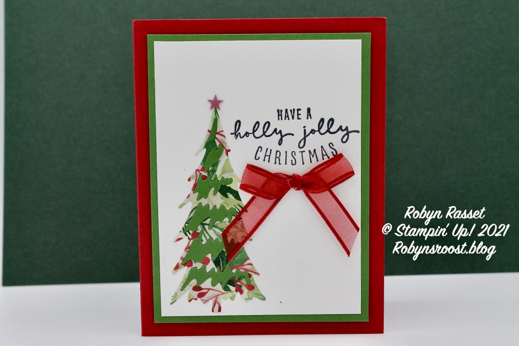 Jan’s card uses bold red and green colors using the Christmas Tree Dies which match the Whimsical Trees stamp set. The greeting is from the Holly Jolly Wishes stamp set. I love the way she has used the Painted Christmas patterned paper for the tree base and garden green cardstock for the highlights.