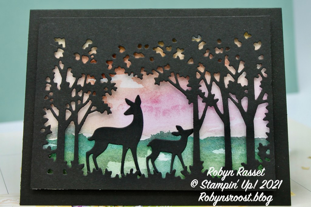 There isn’t any stamping on this pretty card. The deer and trees are all cut with the Grove Dies. The background is a new designer paper called New Horizons. This awesome die set is one that can stand alone without the matching stamp set, but what the heck get the bundle and same 10%.