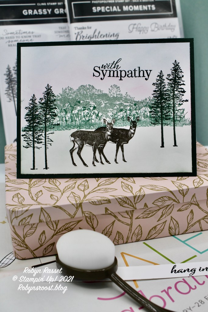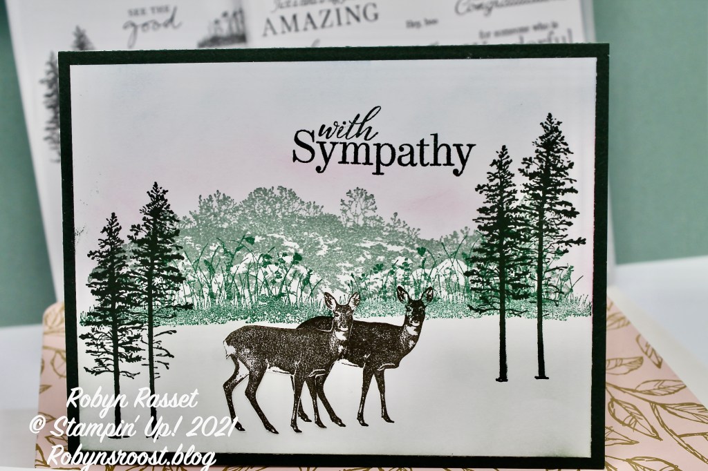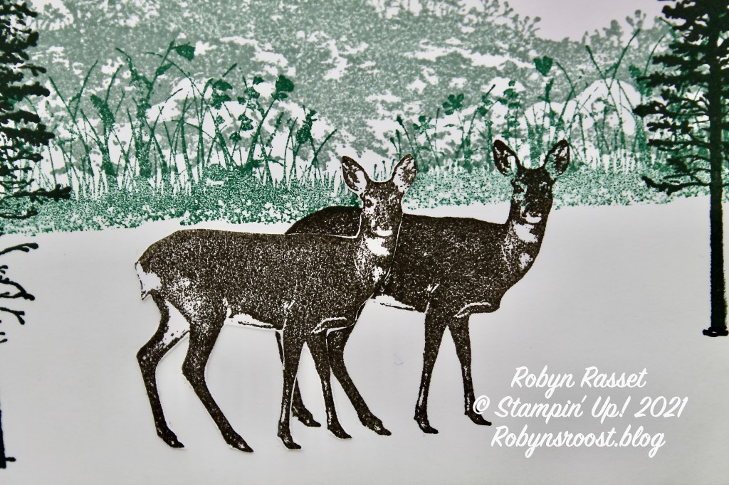 After stamping the images, the white area looked too white. Blending Brushes were used to add a hint of color. Soft Succulent on the bottom, Polished Pink at the horizon and Balmy Blue for the top of the sky. I wanted to capture the image of deer at sunrise. I often see them out in our pasture when I go out to let my horses out of the barn. There is a 4 1/4″ x 5 1/2″ piece of Evening Evergreen behind the Basic White and then it is added to the front of a Basic White Thick card base.