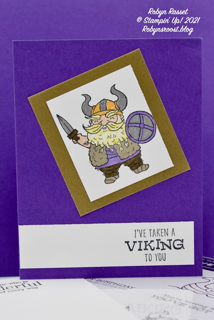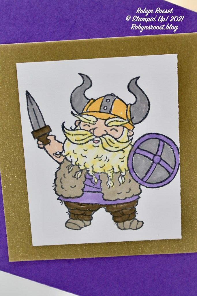 This Brave Viking is stamped on a 2 1/8″ x 2 1/2″ piece of Basic White cardstock using Tuxedo Black ink. It is layered onto a 2 3/4″ x 3″ piece of Gold Shimmer Paper.