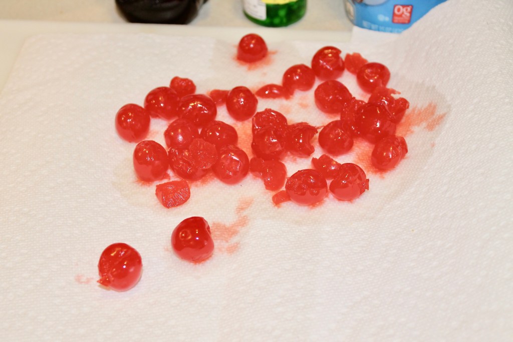 Cherries draining on a piece of paper towel. The drier the better for Chocolate Covered Cherries! Thanks to my neighbor, Patty Falk, I didn’t have to make a dash into town to get more Corn Syrup! I forgot that the cherries needed 3 tablespoons and used it all in the Peanut Brittle.