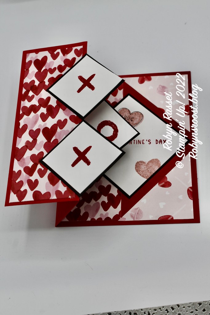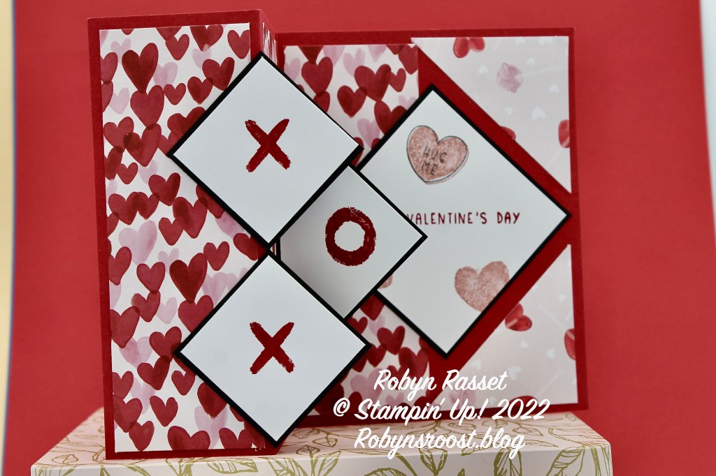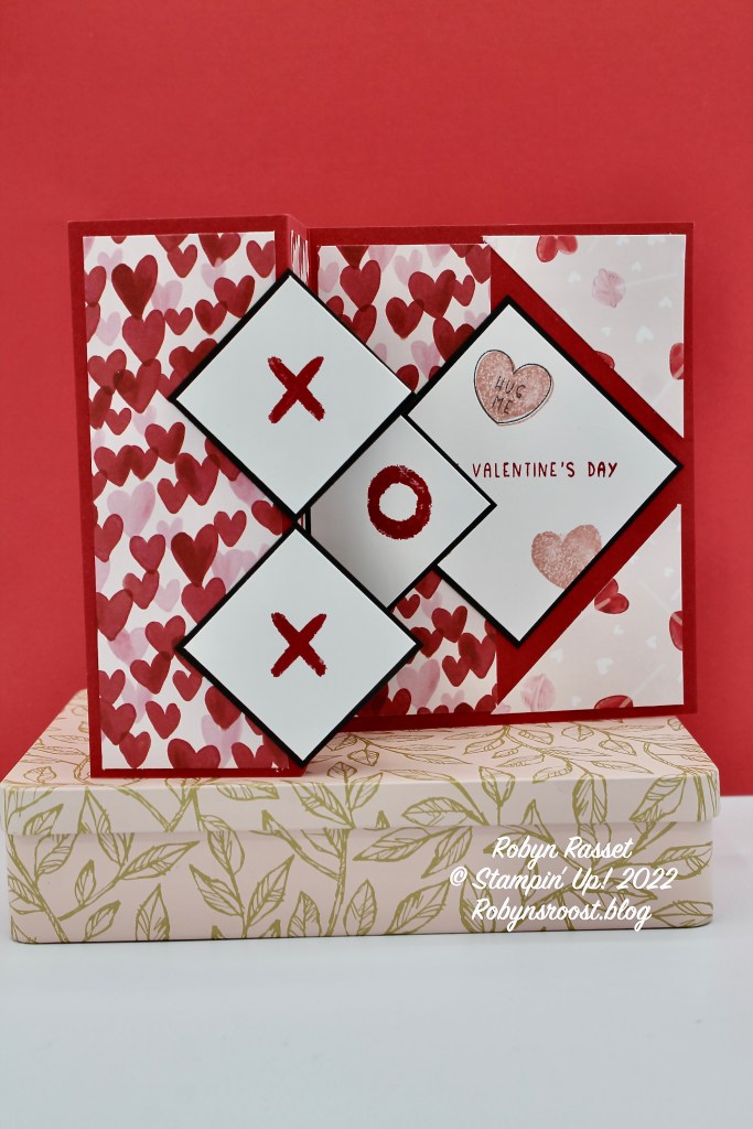 I just had to make another Fold Back Pop-Up Fun Fold card! This one is sending some hugs and kisses for Valentine’s Day. The Sweet Conversations stamp set with the fun ‘conversation hearts’ messages gives lots of options. The matching die set even has a little envelope, I didn’t use any of the dies on this card, but wanted to mention that they are a great addition to the stamp set and, hey, purchase them together and you get a 10% discount.