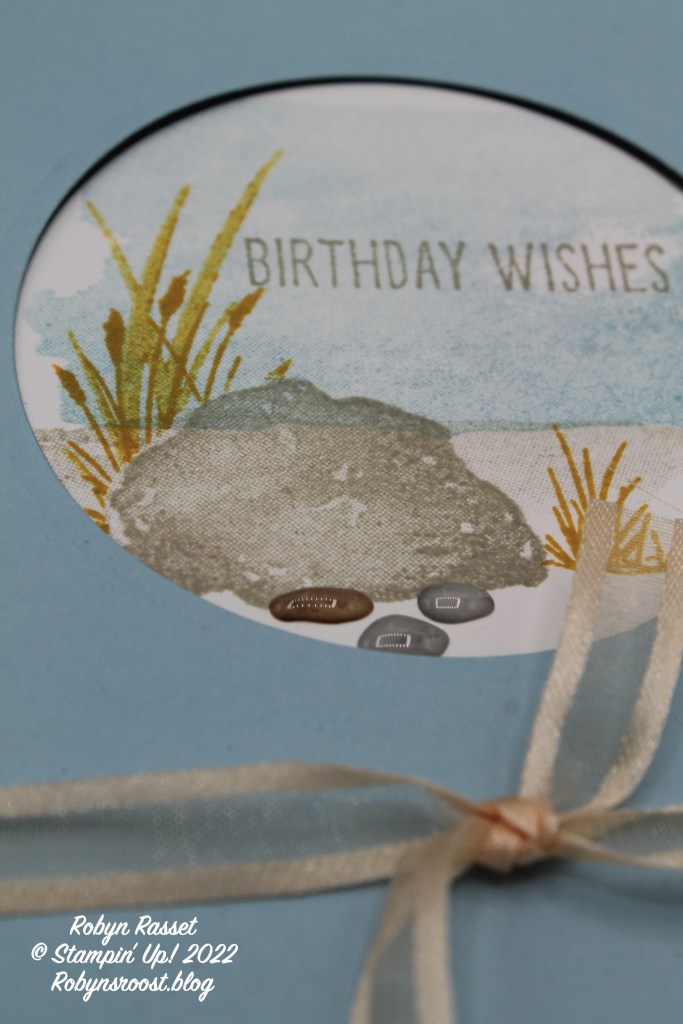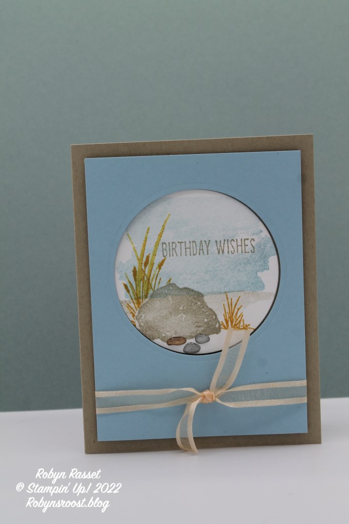 The window on this card is created with a circle die. The Balmy Blue cardstock is adhered with Stampin’ Dimensionals to create some depth. I love the large background stamps in the Oceanfront stamp set. It looks like the background was created with a watercolor brush, but it was actually a stamp!