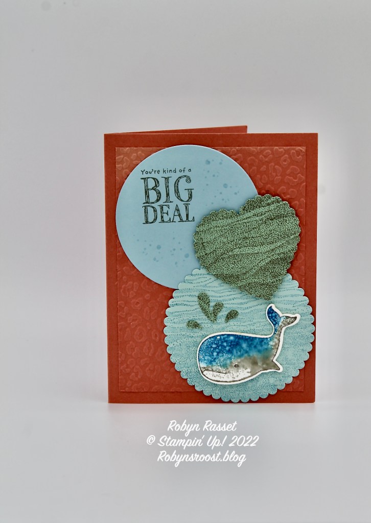 The scalloped circle is also made using the Layering Circles Dies, stamped with the Gentle Waves stamp with Balmy Blue ink. The splashing water from the Whale Punch was punched from the scrap edge of the heart.