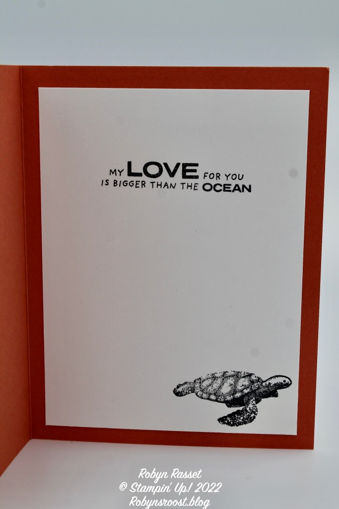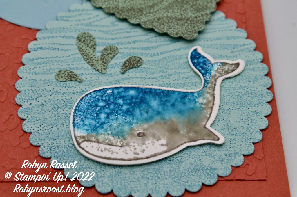 The whale stamp was inked with Pacific Point on the top half and Gray Granite ink on the bottom then spritzed with water before stamping on the white paper. Because of the spritzing the outline became blurred so I went back with a Smoky Slate Stampin’ Write Marker and and darkened the outline, mouth and eye. Instead of using dimensionals, three extra whales were punched from white scraps and glued together with the stamped and colored whale glued on top of them.