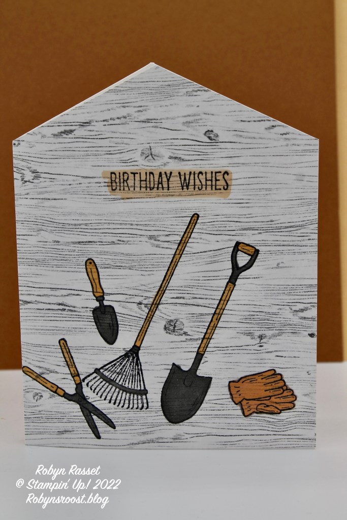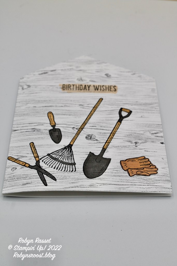 The Home & Garden stamp set first caught my eye because I’m an avid gardener. I loved all of the trowels, gloves, nippers and yard tools. I’ve always thought it would be nice to have a cute little garden shed to pot plants in and store my tools. Alas, instead I have them scattered in the garage, the basement, and the barn. So I thought I would create my own garden shed with a card instead.