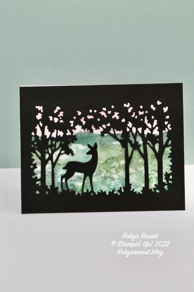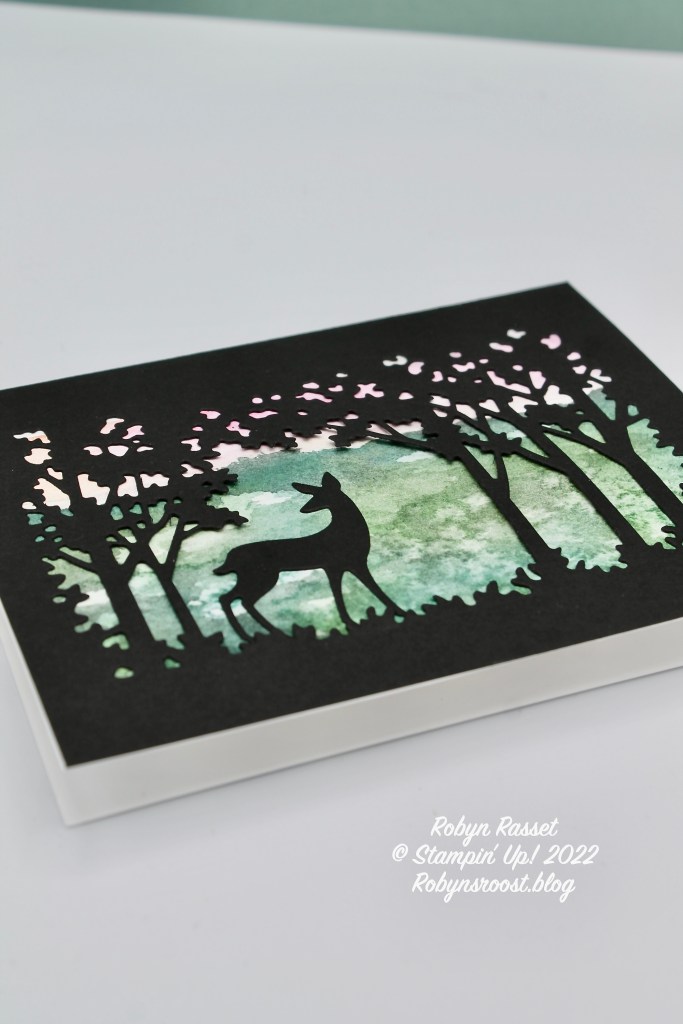 The Grove Die set has a large frame of trees die, plus 9 other dies including the deer used on this card. For this card, a Basic White Thick card base was used, but I think that a Basic Black base would be easier to use. That way if the frame layer wasn’t exactly lined up on the card front it wouldn’t show. The white base does give it a nice clean, crisp look though.