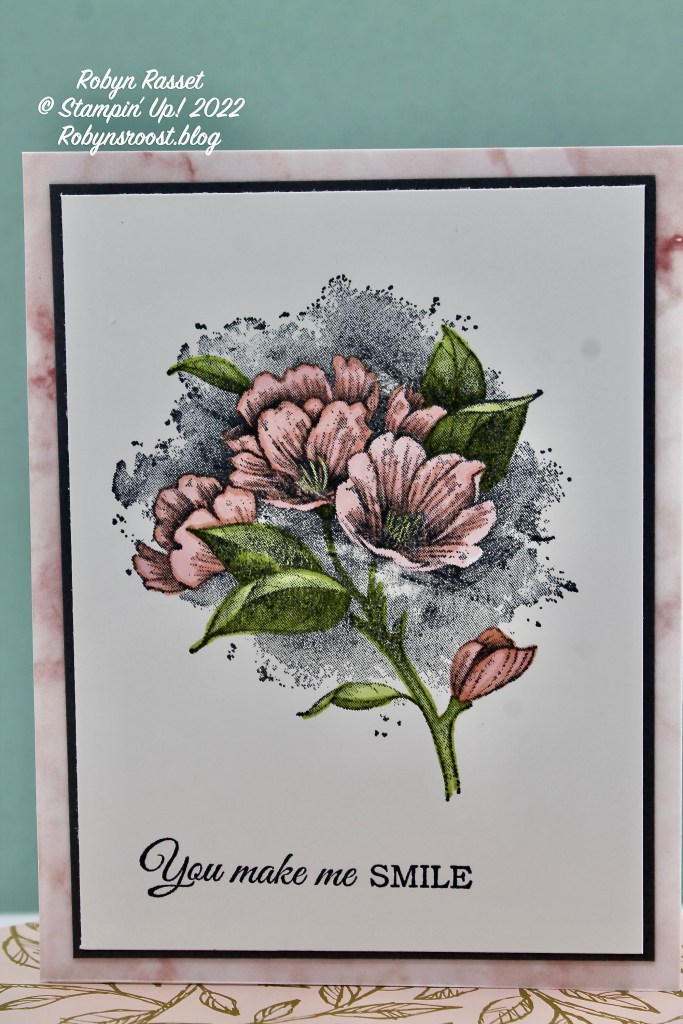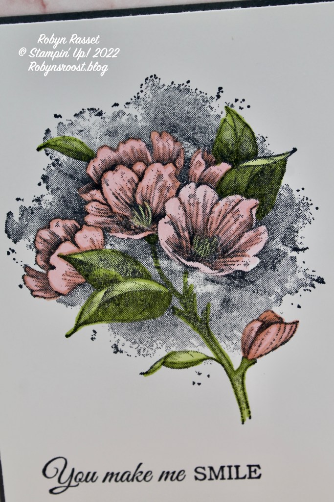 For this card, I used Stampin’ Blends to color, Light Calypso Coral and Dark Flamingo for the flowers, and Light and Dark Granny Apple Green for the leaves.