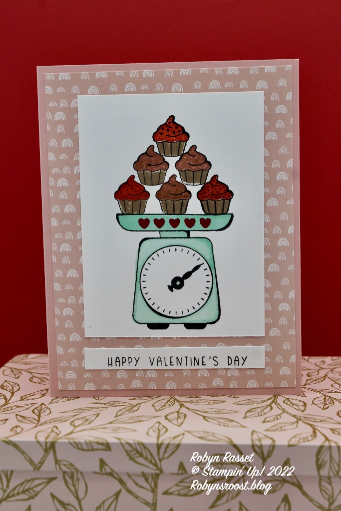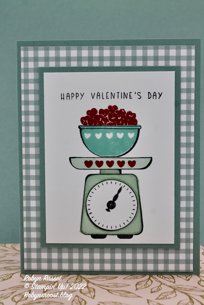 I stamped a bunch of scales onto 3″ x 4″ pieces of Basic White cardstock and then added different items in the bowls and used different colors to create a stack of unique Valentine cards. The bowl and cupcakes have separate stamps to fill in the color but the scale itself did require some coloring. I used Stampin’ Blend Markers to color the scale. This card was done in all soft greens with the background from the Pansy Patch DSP.