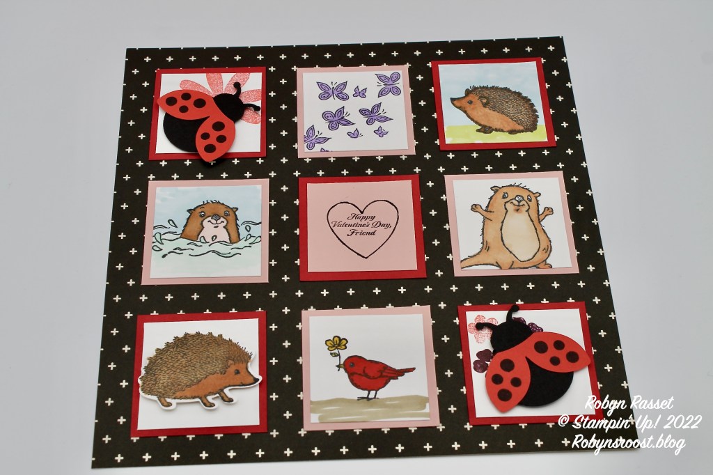 I chose the Hello Ladybug, Awesome Otters, Catching Butterflies, and Happy Hedgehogs for my critters and then added a heart in the middle from the Conversations Hears with a greeting from the Love & Happiness stamp set. To get the heart outline without the words, I just inked the edges of the stamp, then added the greeting from the Love & Happiness stamp set inside the heart. I used a variety of Stampin’ Blend colors, including some of the new skin tone markers to color in the images. I also used the Ladybug and Hedgehog Punches.