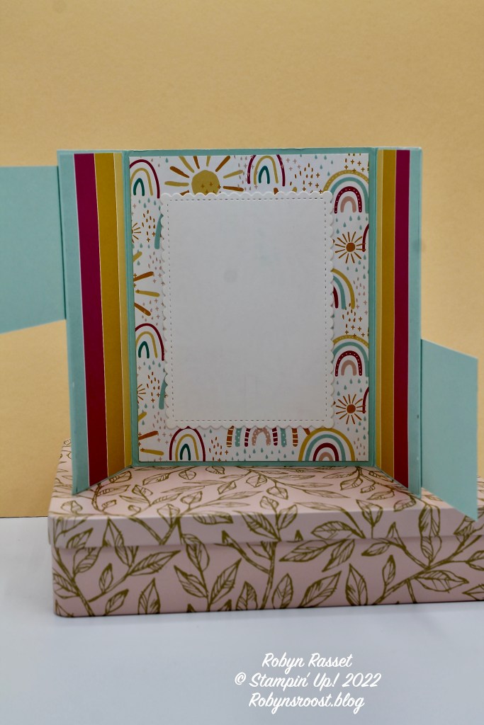 Jill uses 7 patterns from the Sunshine & Rainbows SALE-a-bration designer paper pack. There are 3 different sized die cuts from the Stitched Rectangle Dies.