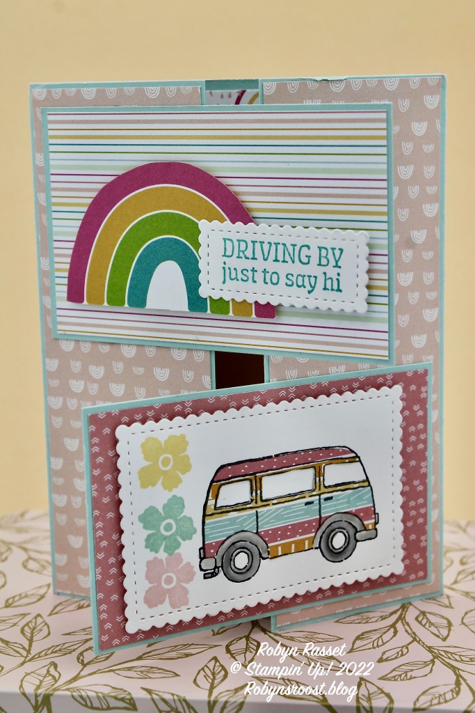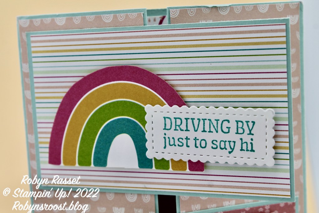 I have such an awesome bunch of swap cards to choose from that it’s hard to decide which to share, but his Driving By gate fold by Jill Hamlett is over the TOP! This card features two of the SALE-a-bration items. The Driving By stamp set and the Sunshine & Rainbows Designer Series Paper.