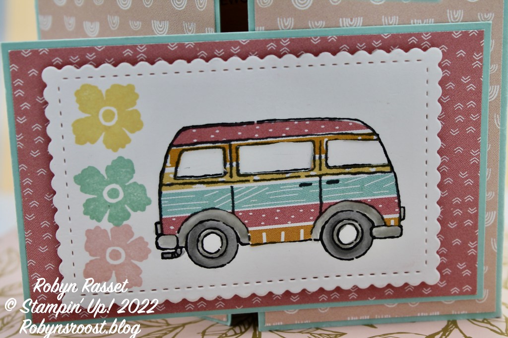 Here is a close-up view of the van. The details are colored with Stampin’ Blend Markers and the flowers are stamped along the side. The back layer on these flaps is 3 7/8″x 2 3/8″ with the designer paper layer being 3 3/4″ x 2 1/4″.