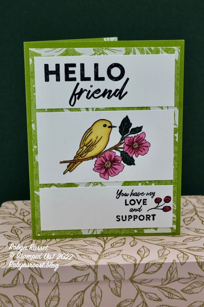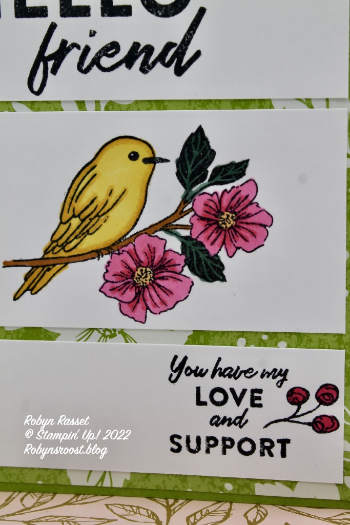 I started with a 3 3/4″ x 5″ piece of basic white, did all the stamping and coloring, then cut the pieces apart. I did end up trimming the smaller pieces a bit smaller so that I had more of the pretty designer paper showing between the white pieces. I think if you started with a 3 3/4″ x 4 3/4″ piece of white it will work out about perfectly. The bird is colored with Daffodil Delight with Polished Pink flowers.