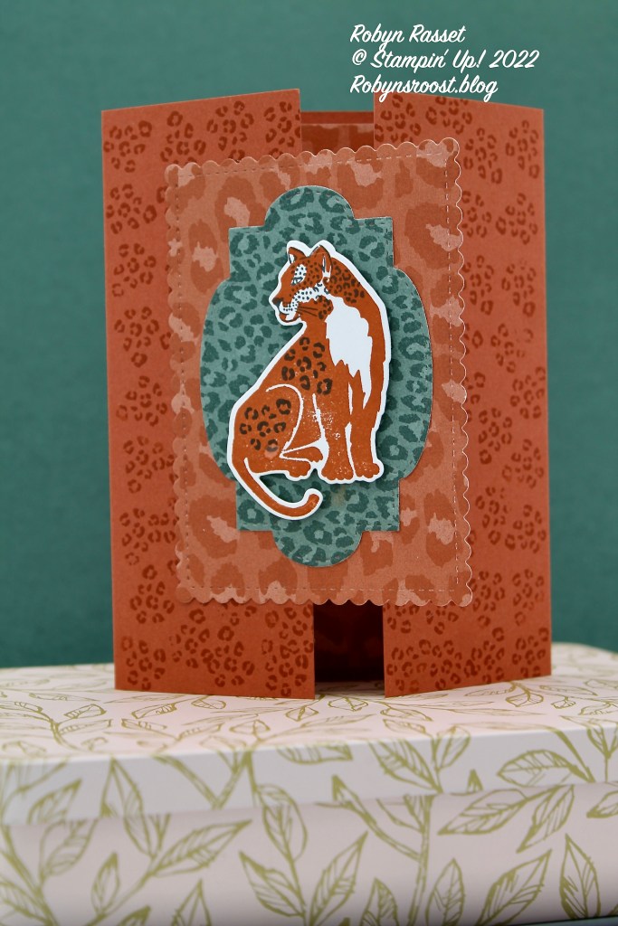 The card base is 8 1/2″ x 5 1/2″ scored at 2 1/8″, 4 1/4″ and 6 3/8″. The scalloped rectangle is die cut with one of the Stitched So Sweetly Dies in a leopard print pattern from the In the Wild Designer Series Paper. The green die cut is also from the In the Wild paper pack and another die from the Stitched So Sweetly Dies. The Wild Cats stamp set has a matching die set, so NO FUSSY CUTTING, YAY!