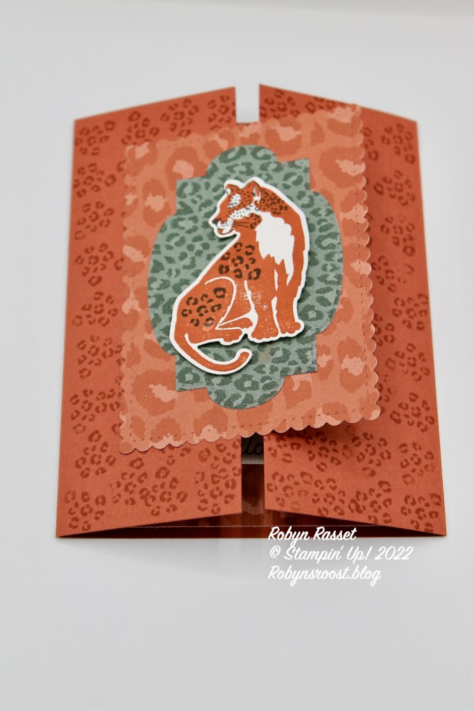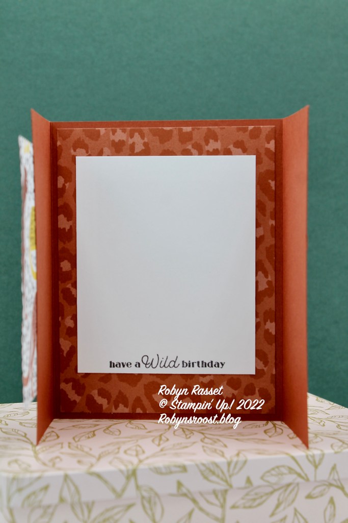 More leopard spots are carried through onto the inside with a another piece of the In the Wild DSP. If you like leopards be sure to check out the whole In the Wild Suite. There is even a leopard patterned embossing folder.
