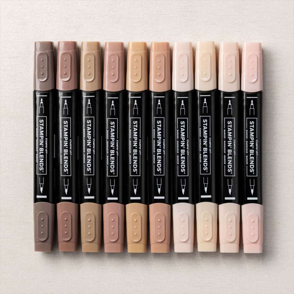 Get the entire range of the Natural Tones Stampin’ Blends Collection with one convenient item number. Or purchase the sets separately. Two markers are included in each set: Stampin’ Blends Light Combo Pack, Stampin’ Blends Medium Light Combo Pack, Stampin’ Blends Medium Combo, Stampin’ Blends Medium Deep Combo, and Stampin’ Blends Deep Combo Pack.
