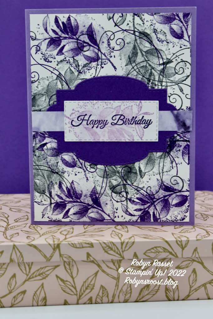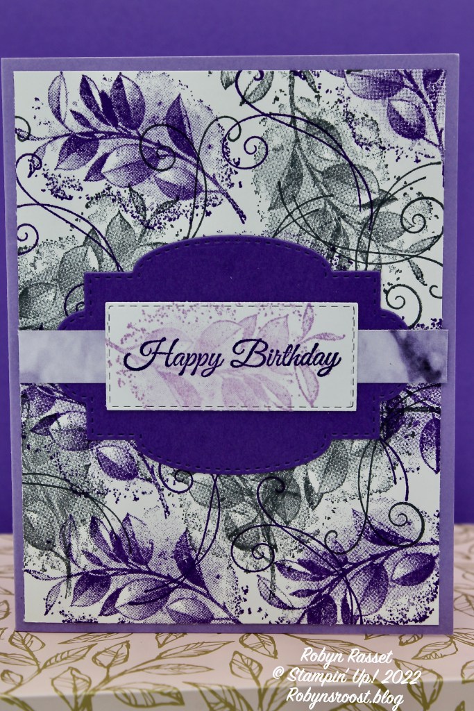 There isn’t any rhyme or reason to the way that I stamped the images. I started with the larger image randomly stamped 4 or 5 times, re-inking each time. Then switched colors and repeated. I then did the same with with swirly stamp. To finish off the card, I adhered the 4″ x 5 1/4″ designed layer onto a Highland Heather card base. The Gorgeous Grape label is die cut from the Stitched So Sweetly Dies and the Greeting Label is cut with the Stitched Rectangles Dies. The floral spray behind the Happy Birthday greeting was stamped with Fresh Freesia ink and then the greeting was stamped over them in Gorgeous Grape. A 1/2″ x 4″ strip of the Simply Marbleous SALE-a-bration paper was sandwiched between the labels.
