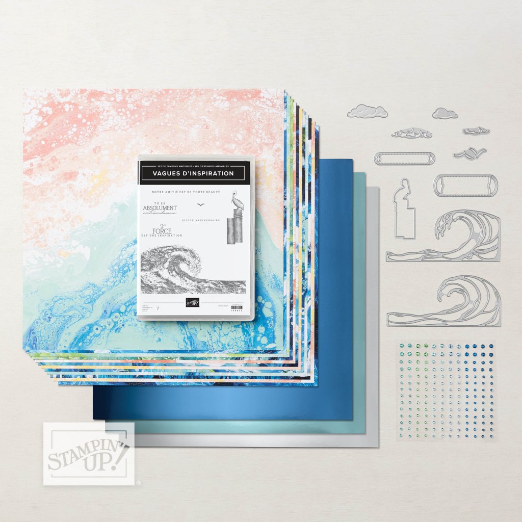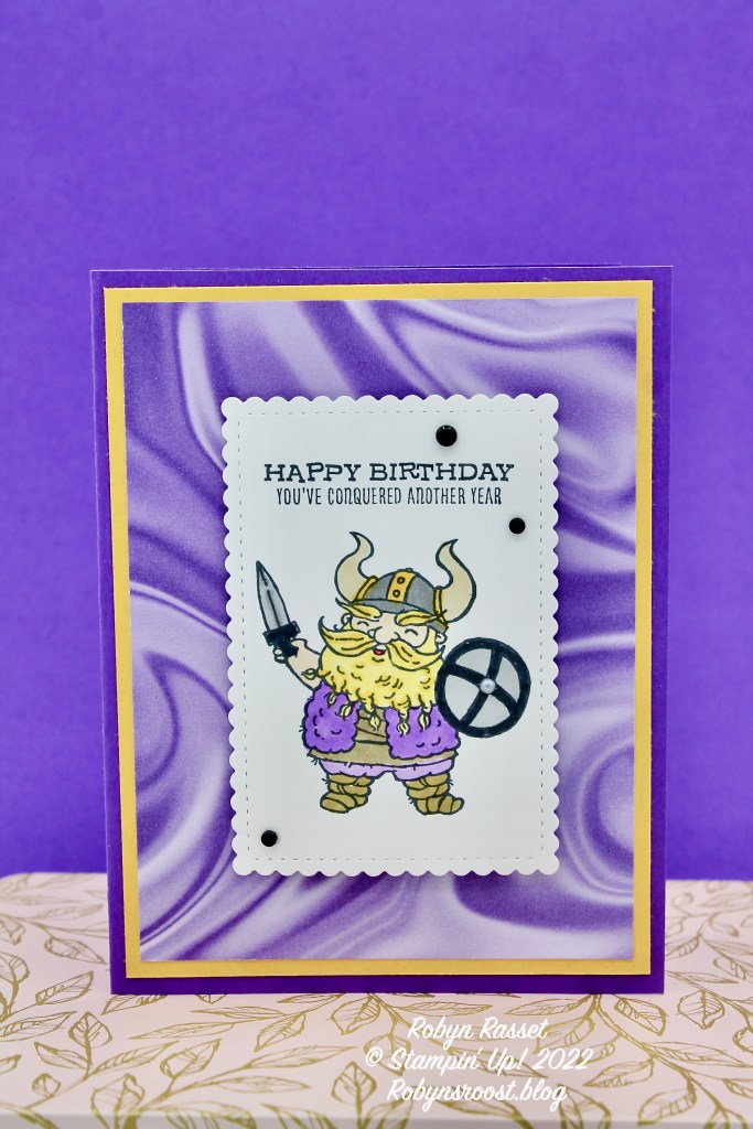 Nicole’s card starts with a Brave Viking which is colored with Stampin’ Blend Markers. This card also features a Stitched So Sweetly die cut. There is a Metallic Pearl dot on the vikings shield and some Matte Black Dots scattered in the background. The swirly, Simply Marbleous Designer Paper makes the perfect background.