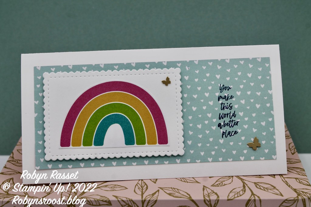 This pretty slim line card created by Terry Rajala uses the Sunshine & Rainbows SALE-a-bration Designer Series Paper and the Rainbow of Happiness stamp set from the January to June Mini Catalog. The white die cut label is from the Stitched So Sweetly Dies and the a couple of little Brushed Brass Butterflies embellishments add a finishing touch.