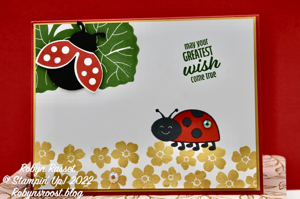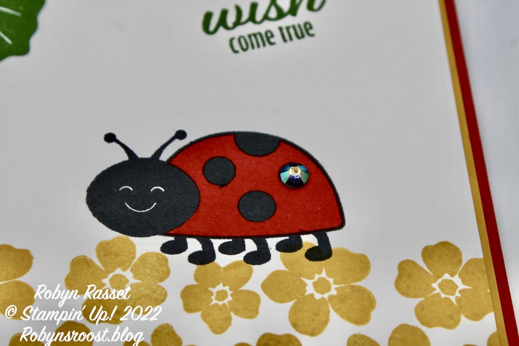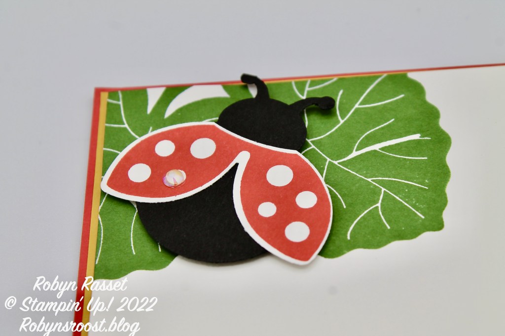 The ladybug in the top corner rests on leaves and is created with the punch and stamps. She also has a little jewel on her wing.