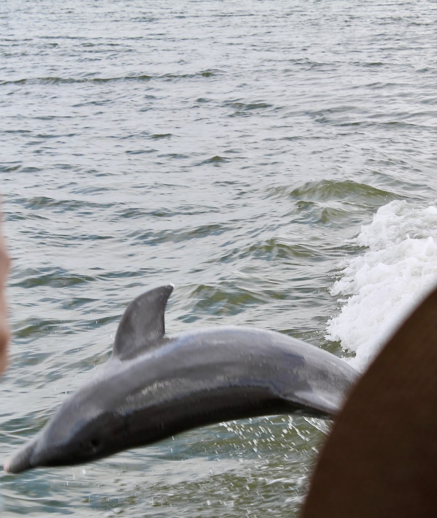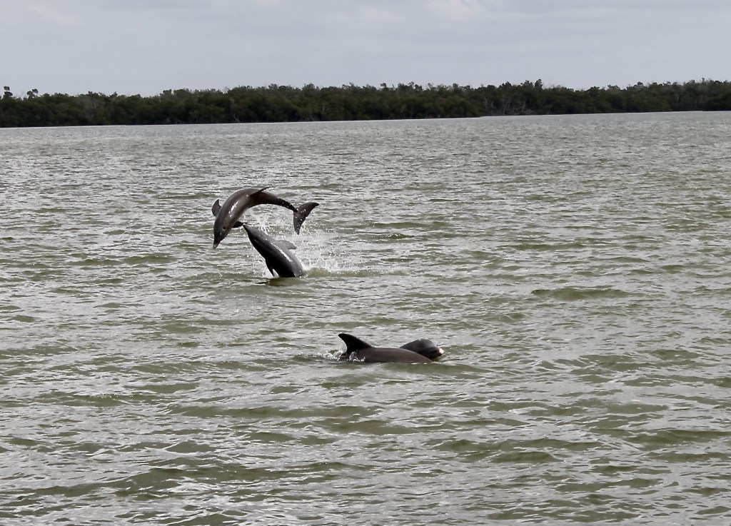 Yesterday, my husband and I went on a boat ride in the Ten Thousands Islands area of the Everglades National Park. We saw lots of mangrove islands, brown pelicans, terns, cormorants and a bald eagle, but the stars of the show were the dolphins! First we saw two males who leaped in our wake but then a pod of females joined them and the boys started to show off!
