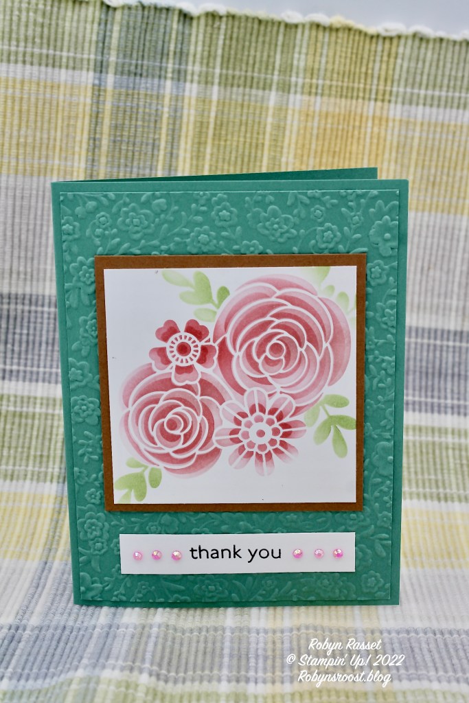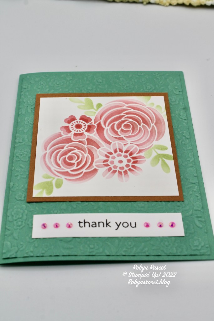 The embossing is done with the Bouquet of Love Embossing Folder and the main image covers up the heart that is in the center of the Bouquet of Love Embossing Folder. The greeting is from the Art Gallery stamp set and the little In Color Jewels added a bit of sparkle to finish off the card.