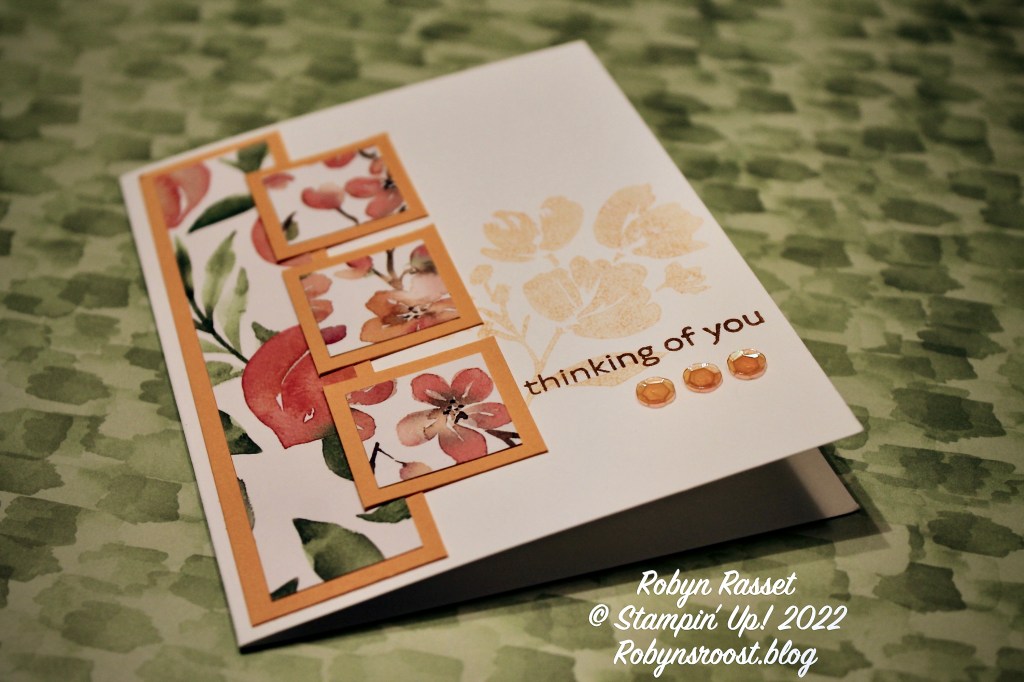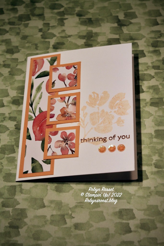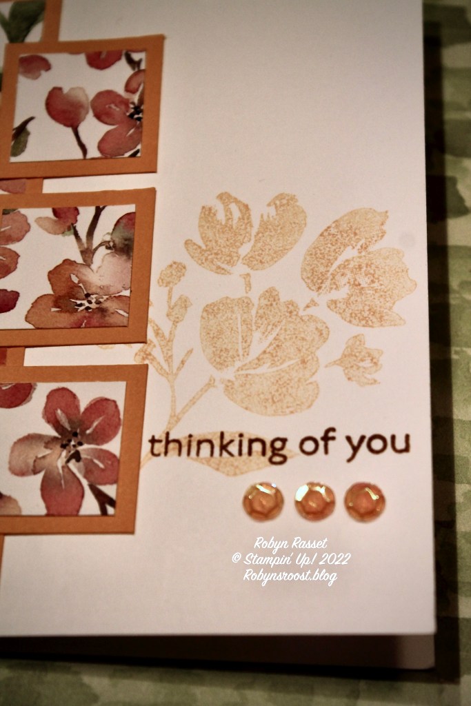 The flower and greeting are from the Art Gallery Stamp set. To make sure that the flower didn’t overpower the greeting, it was stamped off on my grid paper before stamping on the card front. It was done in Pale Papaya ink and the greeting is Cinnamon Cider. I’m sad that the Cinnamon Cider ink is retiring, it’s another favorite of mine! Do you remember the Creamy Carmel from way back? That was another favorite that I still miss, lol. I must be a dull hen to like all the neutral, brown colors, lol.