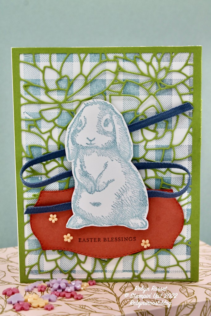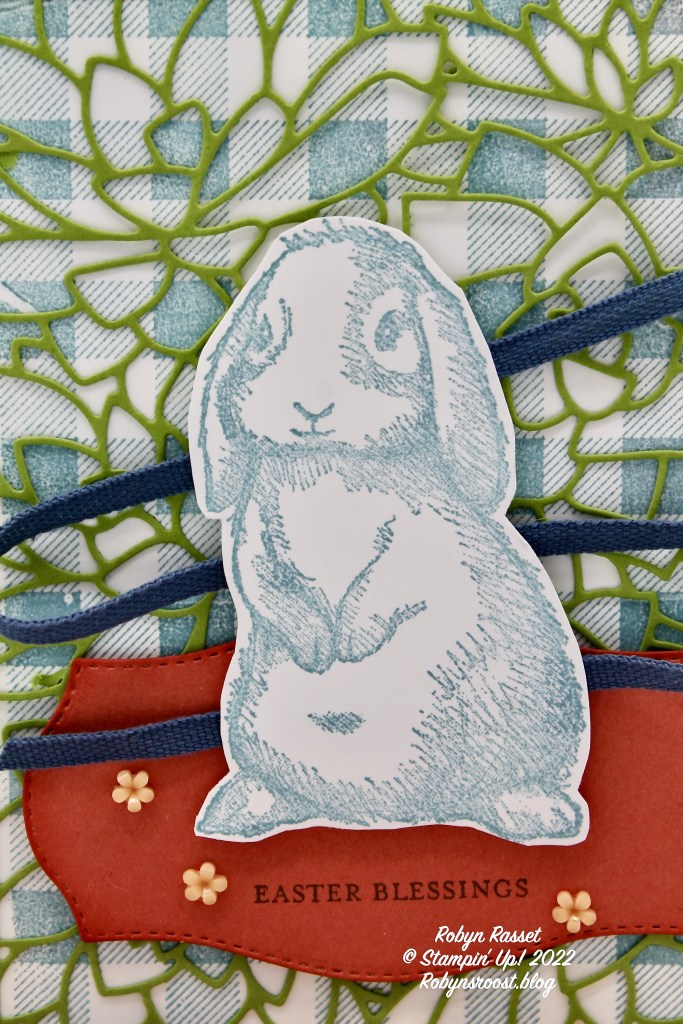 I wanted to add some leafy green to the card somewhere and ended up using the large die from the Succulents Dies. I wanted the checkered background to show through and the Succulents Die is very open and lacy so it worked perfectly. Both the greeting and the bunny are popped up with dimensionals. The ribbon was adhered to the back of the bunny with Stampin’ Seal before the dimensionals were added. The Succulent die cut was adhered with liquid glue added just on the edges. The little Loose Flowering Flourishes were adhered with Glue Dots.