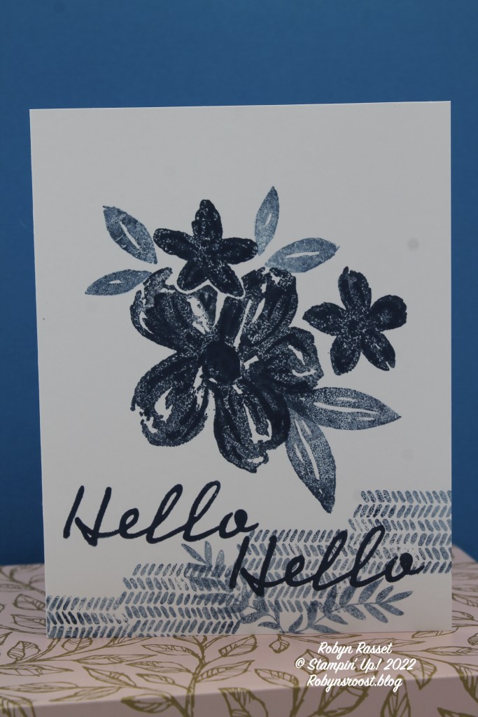 Next, I wanted to use just the stamps and the Misty Moonlight ink to create a simple card with just an extra half sheet of Basic White Thick Cardstock. The images are stamped directly onto the base, no extra layers.
