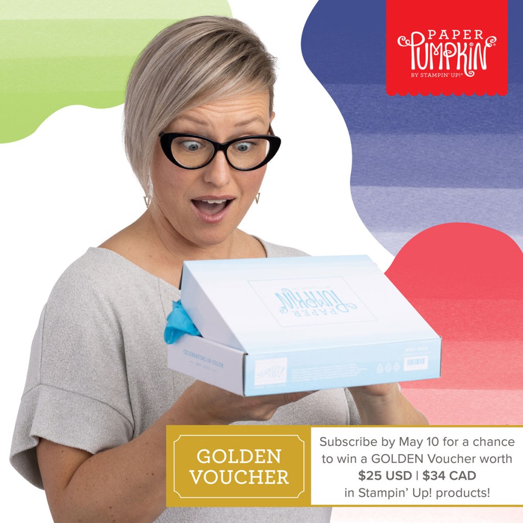 While we are on the topic, Stampin’ Up! has announced that a fun Golden Ticket will be included in some lucky Paper Pumpkin subscriber’s boxes! Remind you of Willie Wonka?