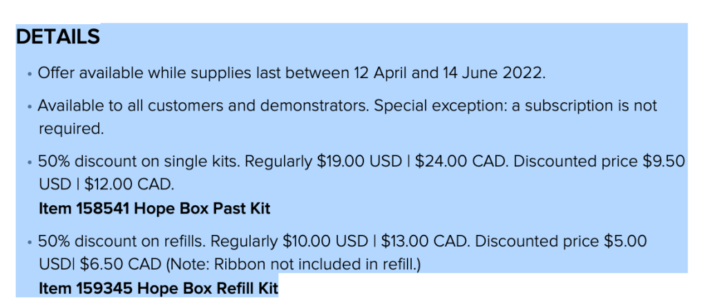 Use the item numbers above to purchase the Hope Box Kit or refill. You don’t have to be a subscriber to order this kit!