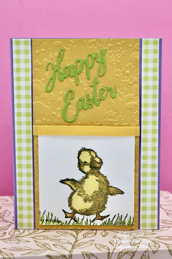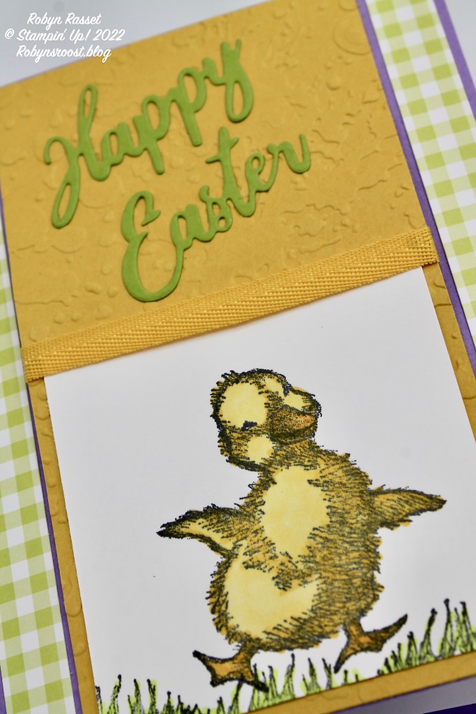 The little duck and grass are stamped with Memento Tuxedo Black ink onto a 2 1/4″ x 2 1/2″ piece of basic white paper and colored with Stampin’ Blends.
